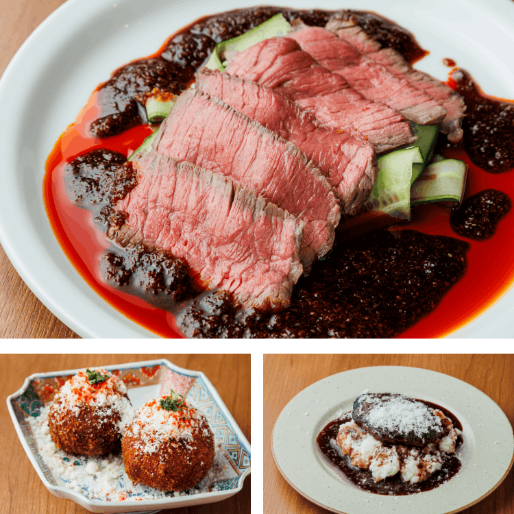 本格中華をベースに、洋のエッセンスを掛け合わせた創作料理をお楽しみいただける「サケヅキ」。なかでもぜひ味わっていただきたいのが、「広島県産なかやま牛ロースト 紅ソースかけ(1,760円)」「エビの香草うまみ爆弾(660円)」「スパイスハンバーグリゾット ヅキソース(1,540円)」の三大名物です。ひと皿ごとに個性が際立つ、当店ならではの味わいをお楽しみいただけます。